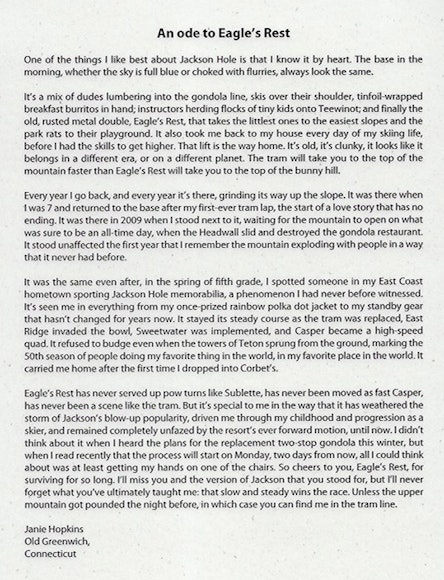 “Eagle’s Rest has never served up pow turns like Sublette, has never moved as fast as Casper, has never been a scene like the tram. But it’s special to me in the way that it was weathered the storm of Jackson’s blow-up popularity, driven me through my childhood and progression as a skier and remained completely unfazed by the resort’s ever forward motion…”