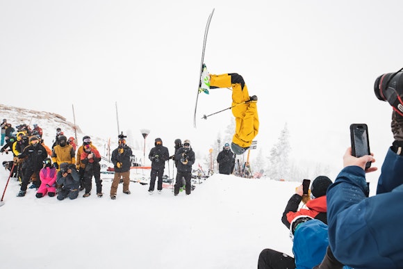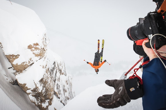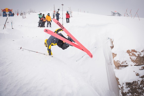 Start order was the result of a random drawing and had skier Aaron Blunck up first. He gamely sent a huge zero spin into the white abyss, exploded immediately in a spectacular crash and skied the rest of the course. At the finish line all covered in snow, he shouted, “I got so worked,” with a huge grin. He then relayed the course conditions up to the anxious throng waiting their turn up top: super deep, hard to see. Next up was last year’s King of Corbet’s Parkin Costain, who stuck his run after a double backflip off the top, came down to the finish line and shouted, “That was the scariest thing I’ve ever done!” with his own massive grin. And so it went. The visibility varied from bad to really bad, but everyone had the same hand and gave it their best shot. Some stuck impressive tricks and some ended in impressive crashes in a huge cloud of powder. (You can see it all, the good, the bad, the ugly, and the fabulous on Red Bull TV)