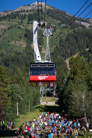 Crisp cool air and sunny skies welcomed the racers this morning for the 2019 Rendezvous Mountain Hillclimb. If there was a perfect day for a race, today was the day. 221 racers gathered at the base of Teton Village in front of the tram anxiously waiting the 8:30am start. What laid ahead of them was over 4,100 vertical feet of elevation gain spanning 6.1 miles until they reached the summit. As race time grew closer, everyone made their way to the starting line with the most competitive runners jostling their way to the front. Slowly the tram moved into position perfectly overhead and final nerves reached an all-time high. Right as the clock hit 8:30am the race was ON.