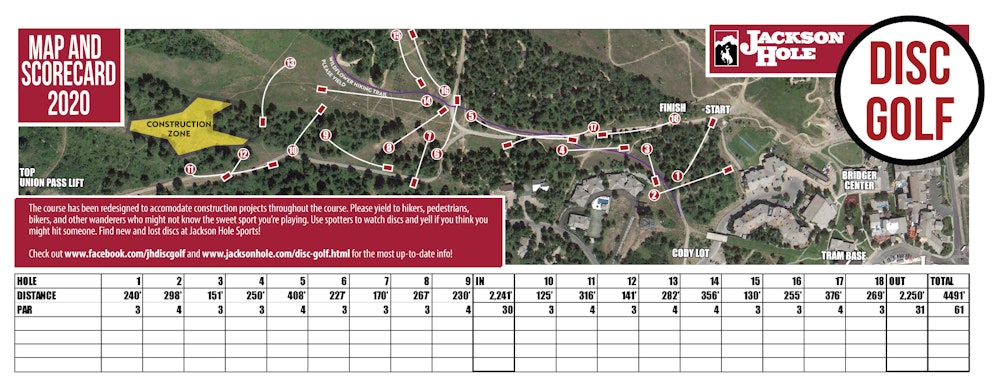 The disc golf course continues to evolve over the years, adapting to new construction projects. This year’s course is fairly similar to the design from 2015, with a few modifications. See below map for accurate holes, distances, and pars. The UDisc+ app is also updated under the most recent “2020 Design” layout. Stay tuned on the Jackson Hole Disc Golf Facebook page and Instagram and our webpage for the most recent updates.