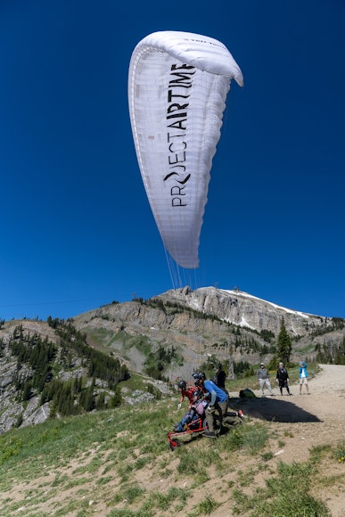 My paragliding career started with speed flying. After my spinal cord injury, I dabbled in a lot of different activities but nothing really grabbed me like speed flying did. After about 4 years post injury, Chris Santacroce (founder of Project Airtime) reached out to me and said in a text, “I dig what you are doing. Just so you know, we are here for you if you ever want to get back in the air”. Shortly after I drove down to Salt Lake and started to learn how to fly with the wheels. The rest is history.