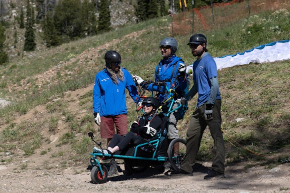 On June 29th history was made at Jackson Hole Mountain Resort (JHMR) when the first tandem adaptive paragliding flight launched from Rendezvous Mountain. Paragliding has a long history at JHMR with thousands of flights taking off from the top of the Bridger Gondola and the Aerial Tram but never before has a tandem adaptive flight launched from JHMR’s steep mountainside. Led, by Joe Stone, who works with Teton Adaptive, whose mission was to bring paragliding to Jackson Hole and let adaptive people experience the sport and smiles.
