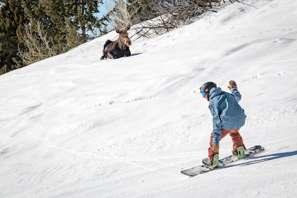 Every couple of years, video footage of a skier or snowboarder at Jackson Hole Mountain Resort being chased by a moose goes viral. The audio usually includes screams, laughter and slight panic. But, try for a moment to put yourself in the hooves of the moose rather than the boots of the snowboarder. Imagine you are scared, threatened, hungry and tired. You’re wandering prime habitat when a human comes flying downhill at high speed out of nowhere. You’ve lost 20 percent of your body mass during the winter months, you’ve spent the last hour foraging through deep snow for twigs and branches, and you’re cranky. You need an hour to rest and digest—moving too quickly could burn through your precious winter reserves. Being startled by a skier doesn’t just feel life threatening—it’s actually putting you at risk of not surviving the harshest season.