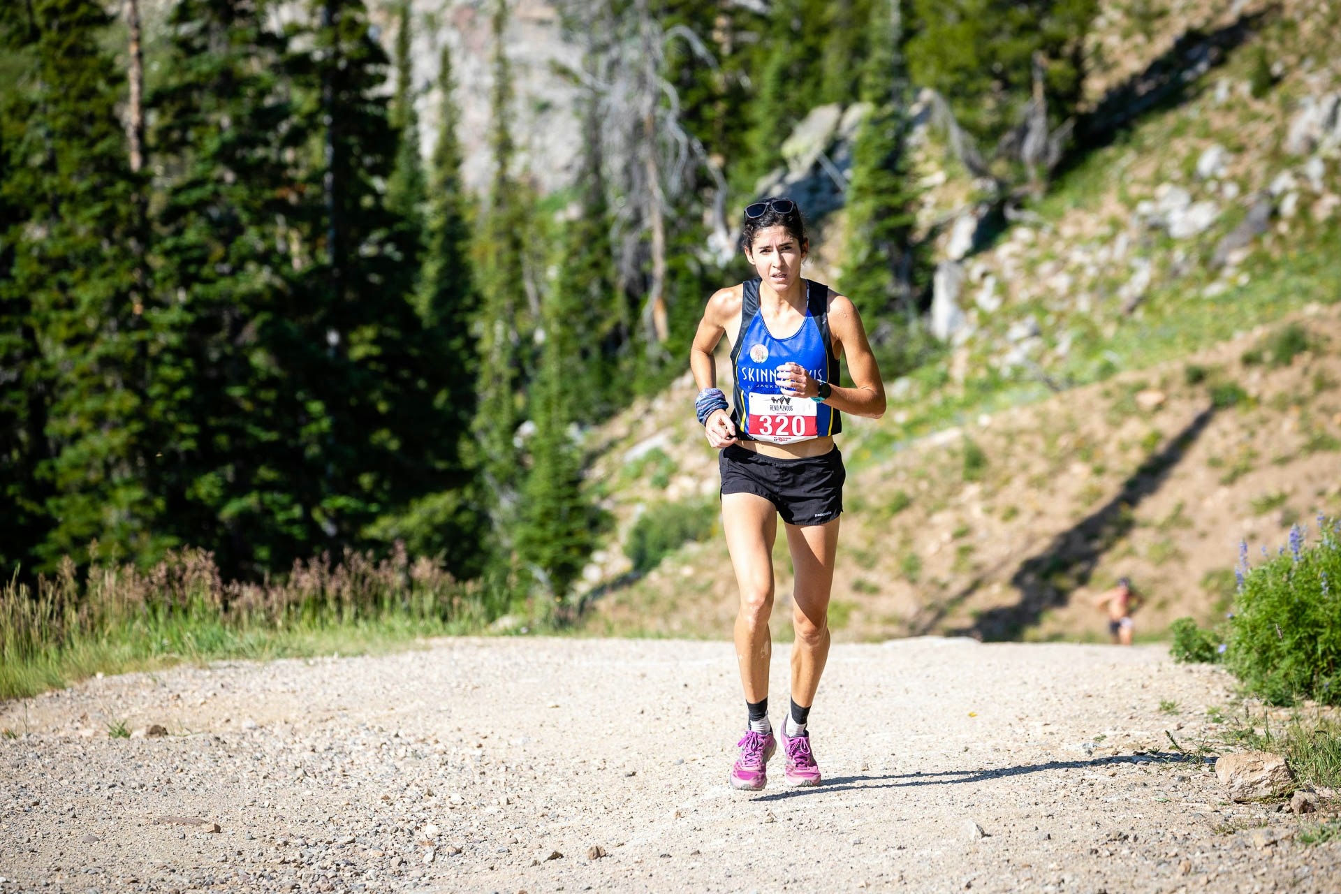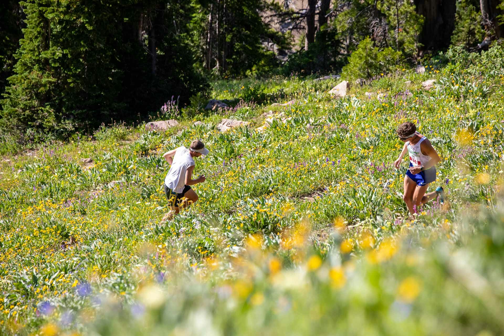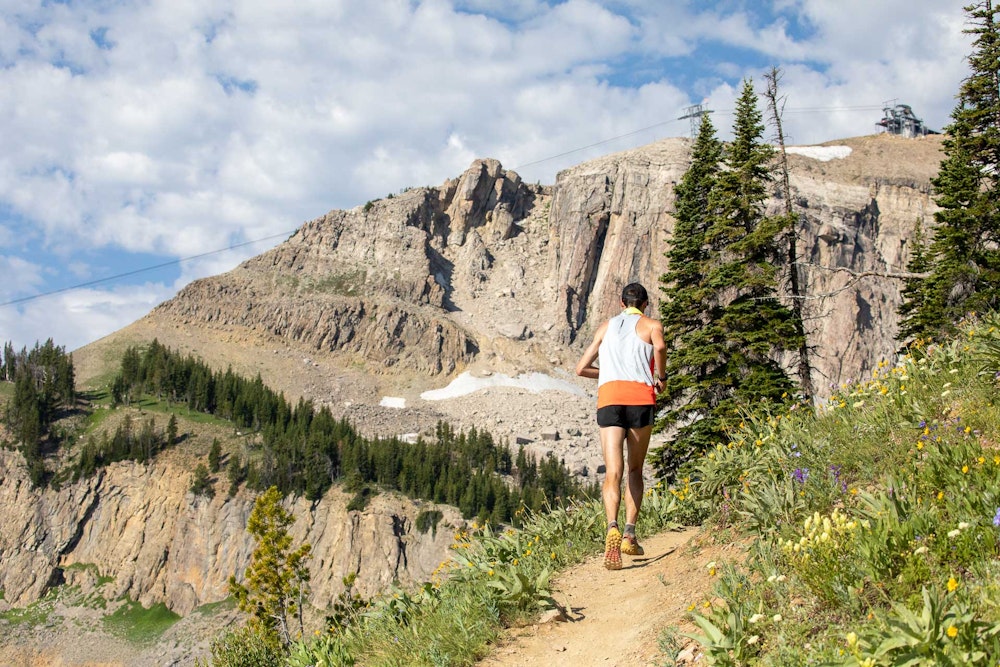 At the shotgun start the racers quickly fell into their running order and began climbing steep single track winding up the Wildflower Trail for the first 3,000 vertical feet to the Rendezvous Lodge. The racers continued on twisting single track though fields of wildflowers up the Headwall on the Cirque Trail eventually passing underneath Corbet’s Couloir.