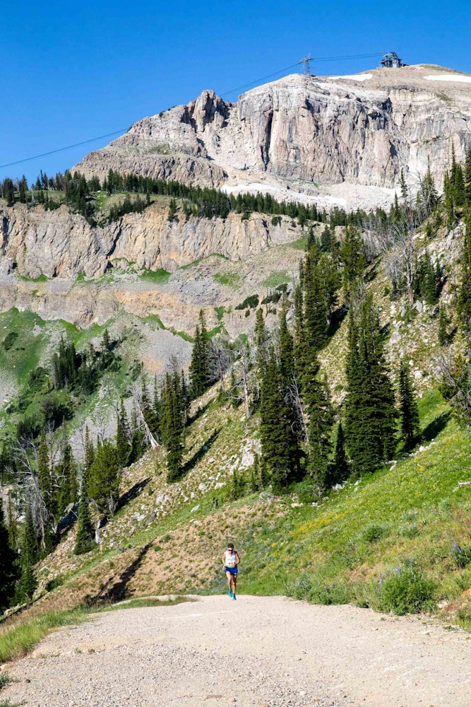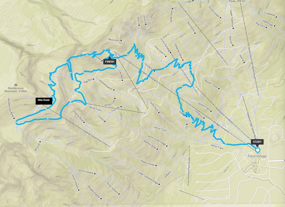 As racers topped out on Tensleep Bowl they used to climb the ridge up Rendezvous Bowl for a final push to the summit of Rendezvous Mountain. Instead the racers were diverted onto the JHMR summer mountain road adding on two additional miles of high paced running on flats, a steep downhill and final uphill push back to Rendezvous Lodge.