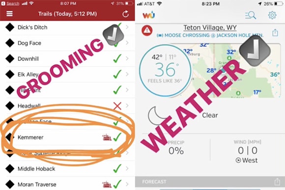 This is something that we were slightly worried about and so we had a number of backup systems in place. We both had the JH Tapped app running, as well as Gordon skied with a Garmin GPS watch, which had a nice run count feature on it. Patrick’s JH Tapped app actually crashed around 96,000 ft (most likely older phone related!) so we were grateful to have all the backups in place.
