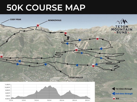 50K Race Course Details: Race Start/Finish is in the Bridger lawn next to the Bridger Gondola uphill to Seven Bridges, continues up Saratoga Trail until it connects with the Wildflower Trail, from there runners will go North on an access road until they reach the bottom of Crags Run where they will ascend the ski run and continue back South until they reconnect with the Wildflower Trail. Runners then continue up the Cirque Trail to the Top of the World where they work up towards Cody Peak until the trail splits. After reaching Cody Peak (10,758 ft), they make their way back down to the Upper Rock Springs trail, out to a service road that winds down to the Rock Springs drainage. Follow the “climbers trail” down for ~4.5 miles until reaching Yurt Trail, connecting back into the Hoback Trail to run back toward the top of Sweetwater Gondola taking the access road next to Saratoga Trail back down to the base area.