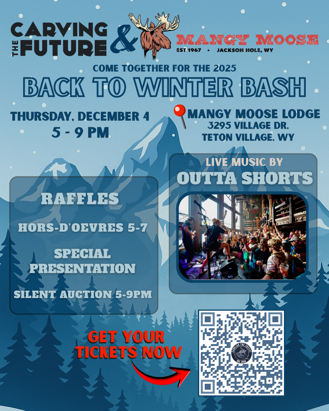 Carving The Future is excited to host our first annual Back To Winter Bash fundraiser on Thursday, December 4th, from 5 PM to 9 PM at the Mangy Moose. This community event will feature live music, a silent auction, passed appetizers, and plenty of fun — all to raise funds and awareness for our mission of empowering youth through boardsports and the outdoors.