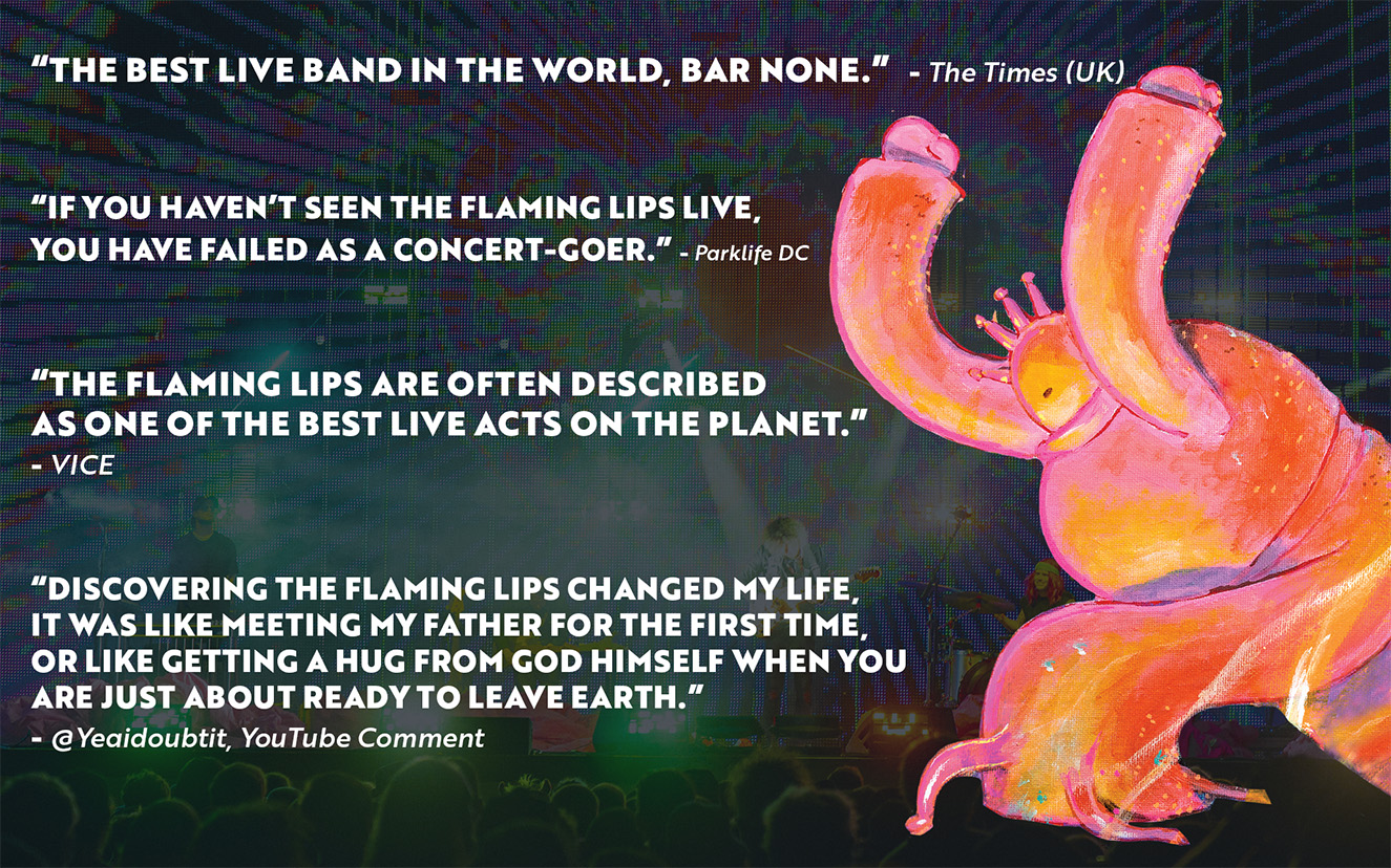 The band has made countless late night television appearances, appeared in a Super Bowl commercial, contributed to many film soundtracks, and collaborated with artists such as Miley Cyrus, Coldplay’s Chris Martin, Kacey Musgraves, Yoko Ono, The Chemical Brothers, and so many more. They have set countless records, broken records, and created spectacular interactive audio/visual events now regarded as legendary.